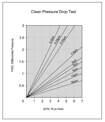 最大操作压力 75 psid (5.1 bar) @ 68°F (20°C) 40 psid (2.8bar) @ 150°F(65°C) 建议更换压差 35 psid (2.4 bar) 流量和初始压差关系图: